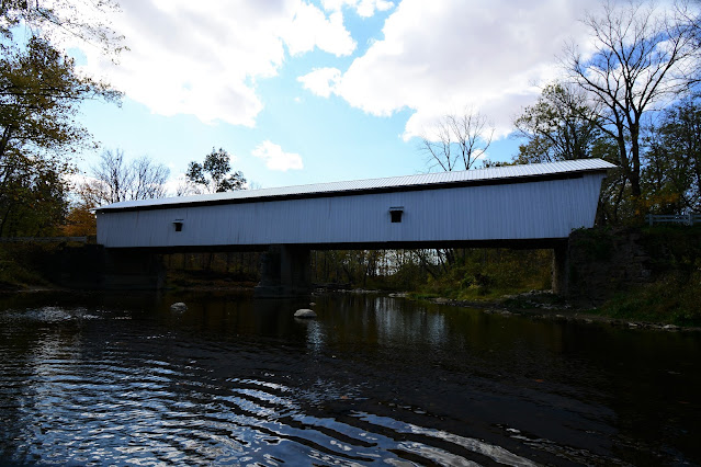 Length - 169' .... W. of Darlington, section 7, Franklin Township. Main St. W. 1.0 miles from jct with CR700E in Darlington, branch right (WNW) on CR500N 0.1 miles, S. on CR600E 0.1 miles to the bridge. Historic records show that George Post from Lafayette, Indiana, built the bridge using components from the Smith Bridge Company in Ohio. Joseph Kress only built the approaches and the end abutments for the bridge. The center pier was added later by an unknown person. Posted to the National Register of Historic Places on November 28, 1990. Closed to motor traffic in 1976. Truss Type - Covered Howe Through Truss.